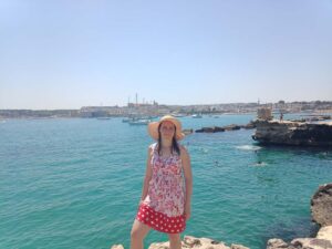 4. nap: ismét túrára indultak a térségben: elsőként a földalatti Torre Pinta-t tekintették meg, mely jelenleg egy magánbirtokon helyezkedik el, egy szálloda szomszédságában. A földalatti részbe a tulajdonos engedélyével mentek be, melyet megtekintve feltérképezték az idők során folyamatosan változó funkcióját. A messzápok idején a halottak hamvainak elhelyezésére szolgált, a görög ortodoxok szakrális hellyé alakították át, míg végül a felszínen toronnyal fedték le, amelyet a galambok lakhelyéül építettek hozzá. Ezt követően egy megalitikus építészeti emléket tekintettek meg, mely Olaszországban az elsőként feltárt kulturális építmény ebből az időszakból. Ezt tanulmányozva arra lehettek figyelmesek, hogy szakrális funkciót látott el. A kőépítmény tetején a kör alakú lyukak vélhetően arra szolgáltak, hogy az áldozati állat vérét elvezessék. A tanári magyarázatból megtudhatták, hogy a nyári napéjegyenlőség idején megvilágított rész árnyéka kivetül a belső kőre, ahol kört alkot. A jelenséget megelevenítő képződmény neve Dolmen Li Scusi. A dolmen szó jelentése a helyi dialektusban ’rejtőzködni’, így a neve is utalhat a sokak által misztifikált jelentőségére. Ezután egy hasonlóan prehisztorikus emlék, a giuggianellói Menhir megtekintésével folytatódott az útjuk, melynek akkoriban a formája miatt tulajdonítottak jelentőséget, hiszen az alakja hasonlít a Vénusz-szobrokéhoz, ráadásul lábai kelet felé vannak tájolva. Így tudomást szerezhettek arról is, hogy szakrális helyként használták, vagyis a nők annak érdekében, hogy termékennyé váljanak, ráfeküdtek a Vénusz alakú szoborra, kérve az égiek és a természet segítségét. A túra zárásaként egy istállót tekintettek meg, mely az utóbbi időben számos film forgatásának helyszínéül szolgált, például a Mine Vaganti film kezdőjelenetében is látható. Az úton hazafelé tartva a kurzusszervező még lehetőséget kínált számukra megtekinteni az ország legkeletibb pontján elhelyezett kilátót, ahonnan szabad szemmel láthatóak az albán hegyek, így beigazolódott, hogy miként vált a középkorban a Kelet Kapujává Otranto városa.
